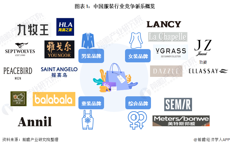 中国服装行业竞争者众多,其中A股上市服装企业中,代表企业有海澜之家、森马服饰、雅戈尔、太平鸟、美邦服饰、报喜鸟、安正时尚、锦泓集团等。各企业旗下品牌按细分市场可分为男装品牌、女装品牌、童装品牌和男女装兼备的综合品牌,其中男装品牌代表有海澜之家、雅戈尔、太平鸟男装等;女装代表品牌有LANCY、VGRASS、玖姿等;童装品牌有balabala、Annil、拉比等;综合品牌代表有森马、美特斯邦威等。