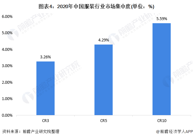 2020年,中国服装行业CR3为3.26%、CR5为4.29%、CR10为5.59%。综合看来,我国服装行业市场集中度较低,竞争较为激烈。