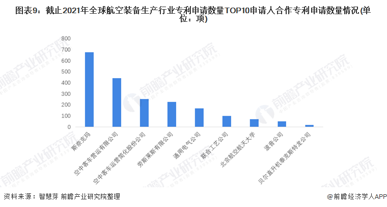 从统计数据来看,截止2021年12月30日,全球航空装备生产行业合作专利申请数量TOP10的企业为斯奈克玛,其数量超过650项,其次为空客运营,合作专利申请数量为440项。