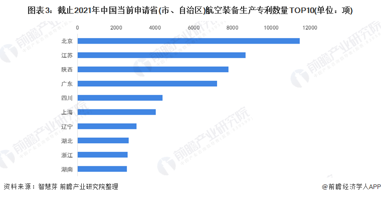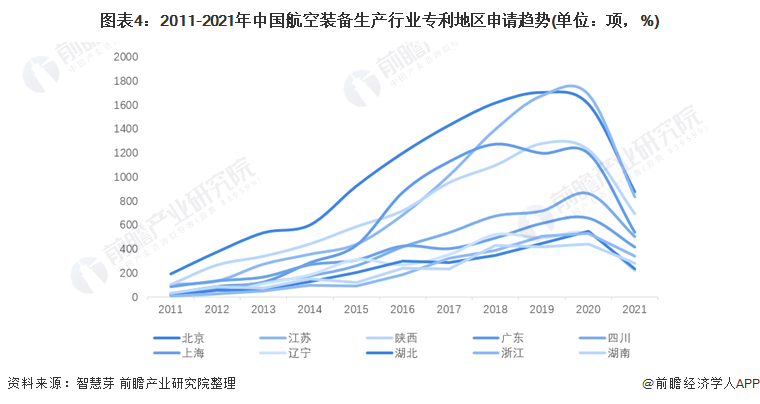 趋势方面,2011-2019年期间,北京航空装备生产专利申请量持续保持在全国首位,2020年江苏省首次超过北京市,成为全国航空装备生产专利数量最多的省份。