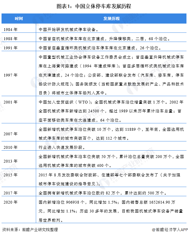 本文核心数据及观点:中国立体停车库发展历程、中国机械式泊车位结构、中国机械车库招标项目设备类型分布
