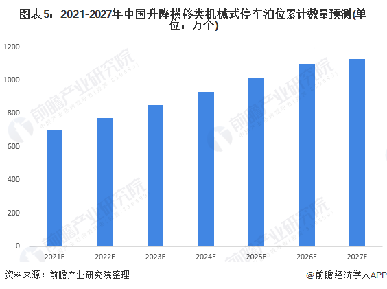 升降横移式立体车库设备可灵活组合成单列式、重列等排列方式;空间利用率最高,达到停车数量最大化,是目前市场上应用最广泛的立体车库,市场增长潜力较大。2015-2020年我国升降横移类机械停车新增泊位每年在70万个左右。未来随着下游应用市场的增长,预计2021-2026年我国每年新增升降横移类机械停车泊位数量将以3%左右的增速增长,预计到2027年我国升降横移类机械式停车泊位累计数量将达到1130万个。
