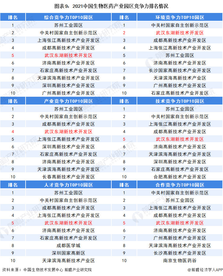此外,科技部旗下中国生物技术发展中心发布的《2021中国生物医药产业园区竞争力评价及分析报告》显示,全国生物医药产业园区中,武汉东湖高新技术产业开发区在综合、环境、产业、技术、人才、合作竞争力等方面均位居全国前五。