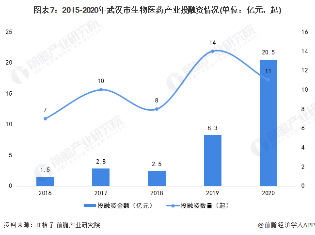 根据IT桔子的统计,2016-2020年间,武汉的生物医药投融资事件数及投融资金额均呈现明显的波动增长态势。2020年,武汉市生物医药产业投融资事件数为11起,投融资金额达到20.5亿元,较2019年大幅增长。