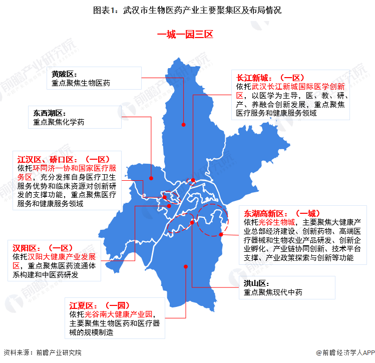 生物医药产业是武汉市四大国家级战略性新兴产业集群之一,也是武汉市大健康产业重点布局五大领域之一。近年来,武汉市在一系列政策的指导下加快了大健康产业布局,构建了“一城一园三区”的空间格局。其中,光谷生物城作为大健康产业布局核心,也是生物医药产业的主要驱动核,协同江夏区、洪山区、汉阳区、东西湖区、黄陂区等区域共同发展武汉生物医药产业。