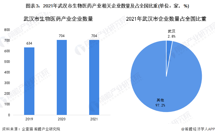 2019-2021年,武汉市生物医药企业数量呈上升趋势。截至2021年底,武汉市共有704家生物医药相关企业,企业数量占全国企业数量的2.8%。