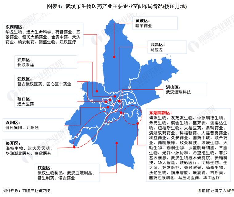 从重点企业的空间布局来看,武汉市东湖高新区聚集的生物医药企业数量较多,例如人福医药、友芝友生物、禾元生物、鼎康生物等企业均落位于此,武汉逐渐形成了以光谷生物城为核心的生物医药产业聚集地。