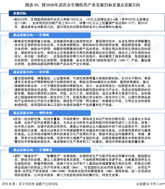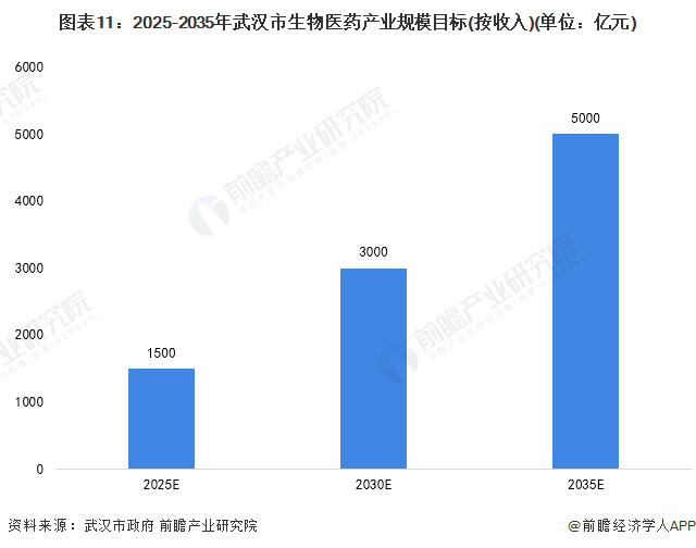 根据武汉市政府印发的《武汉市大健康产业发展规划(2019-2035年)》,武汉在生物医药领域将重点从生物药、化学药、现代中药和生物服务四个方向发展,到2025年,武汉生物医药产业收入突破1500亿元,到2035年,武汉生物医药产业收入突破5000亿元,建成具有全球影响力的,国内领先的创新药物研发中心和成果转化基地。