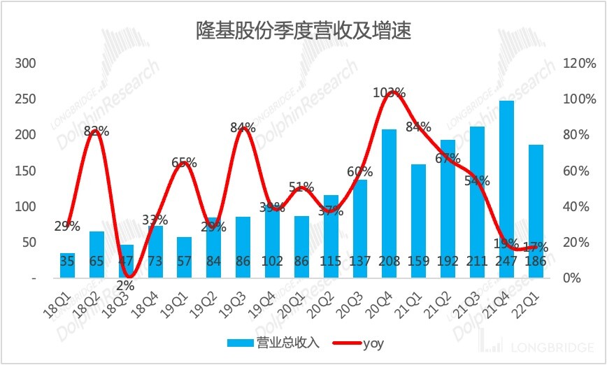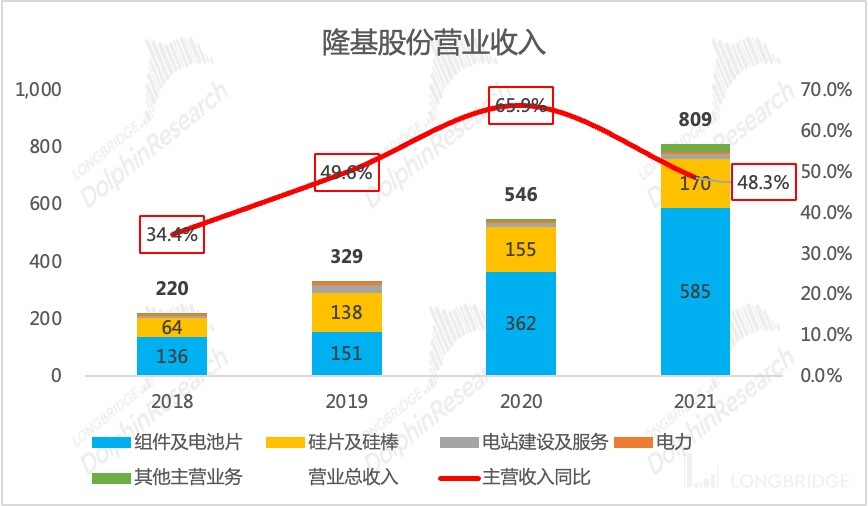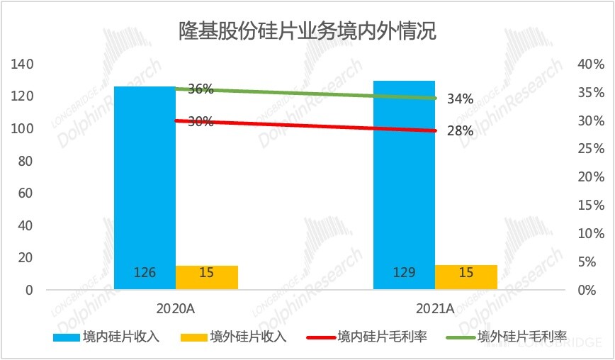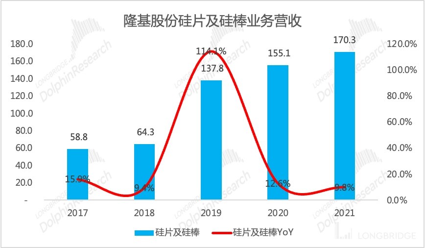 2021 年全年,公司硅片及硅棒业务(大部分为硅片)实现营收 170 亿元,同比增约 10%,跑输光伏行业和公司组件业务。