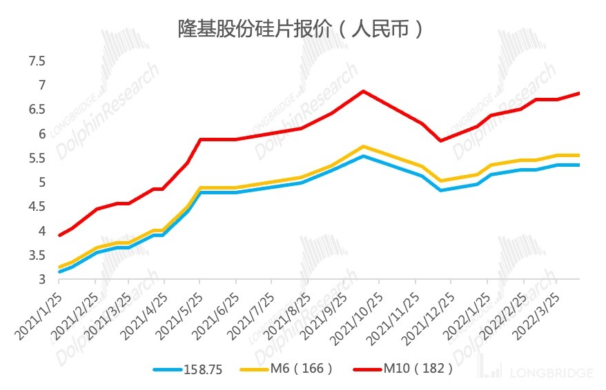 从硅料和隆基股份硅片价格走势来看,2022 年开年以来,硅料价格虽然重新回到上涨趋势,但仍旧没有到去年四季度的高点,而隆基股份的硅片价格在经历多次涨价后以及和去年价格高点持平。