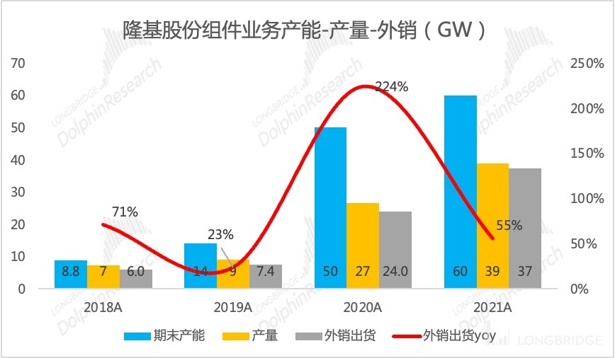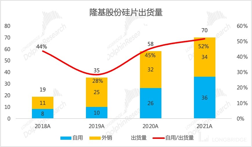 而国内市占率的稳定部分原因依赖自身组件业务的内部消化,2021 年公司外销硅片出货量同比仅增 7%。
