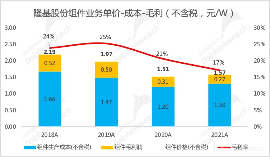 成本压力未全部传导,毛利率受损。公司组件被迫跟随行业微涨,但涨幅 4% 并没有将成本端的压力全部传导给下游,价格上涨幅度不及成本上涨幅度,毛利率受损,2021 年公司组件毛利率 17%,同比下滑约 4 个 pct。