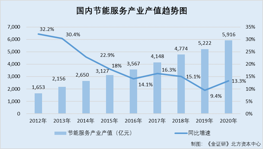 据节能协会节能服务产业委员会数据,2012-2020年,国内节能服务产业的产值分别为1,653亿元、2,156亿元、2,650亿元、3,127亿元、3,567亿元、4,148亿元、4,774亿元、5,222亿元、5,916亿元,同比增速分别为32.2%、30.4%、22.9%、18%、14.1%、16.3%、15.1%、9.4%、13.3%。