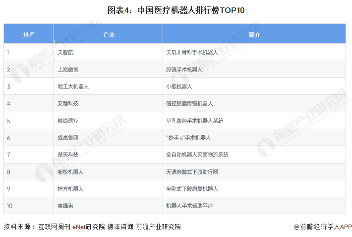 从我国医疗机器人市场来,2022年6月,由互联网周刊、eNet研究院、德本咨询联调的2021医疗机器人企业排行榜出炉。其中,天智航、上海微创、哈工大机器人、安翰科技、精锋医疗、威高集团、楚天科技、新松机器人、神方机器人、赛诺微等十家企业荣登TOP10。
