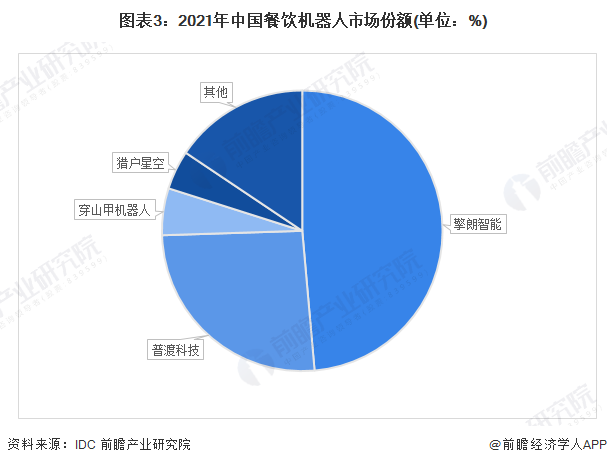 从我国餐饮机器人市场来看,IDC2022年6月发布《中国餐饮行业商用服务机器人市场份额报告》显示,擎朗智能、普渡科技、穿山甲机器人、猎户星空等厂商占据了市场主要份额。其中,擎朗智能、普渡科技两大头部厂商分别占据市场份额的48.6%和25.9%,头部效应明显。