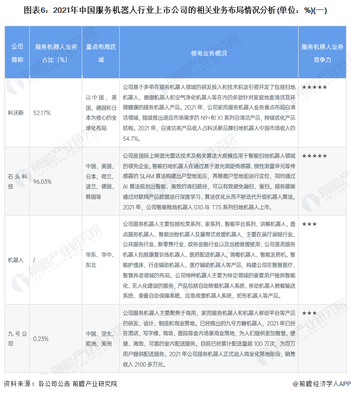我国服务机器人行业上市公司中,科沃斯、石头 科技、九号公司等产业布局较广,积极发展全球化战略,其余企业主要布局境内地区,主要集中与华东与华北等。