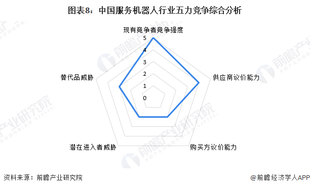 运用波特的“五力”模型,对服务机器人行业的竞争环境分析中,对各方面的竞争情况进行量化,5代表最大,0代表最小,服务机器人行业的竞争情况如下图所示: