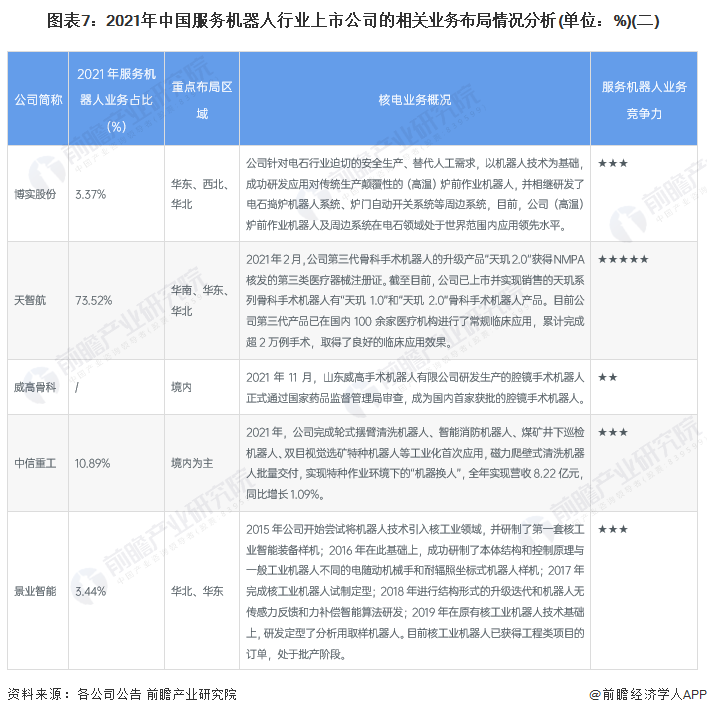 从企业服务机器人业务竞争力来看,科沃斯、石头 科技、天智航等在各自领域内市场竞争力较强。