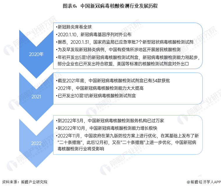 自2019年底,新冠疫情在中国出现后,中国新冠病毒核酸检测行业迎来的发展契机。2020-2021年是中国新冠病毒核酸检测发展最关键的两年,新冠病毒核酸检测成为2020-2021年中国唯一的新冠肺炎大众筛查“侦查手段”。2022年3月,疫情联防联控机制综合组印发了《新冠病毒抗原检测应用方案(试行)》,该政策在原有的核酸检测基础上,增加抗原检测作为补充,但核酸检测仍为主要手段。2022年11-12月,中国新冠病毒核酸检测行业因中国新冠疫情防控政策的变动而进入关键调整时期。