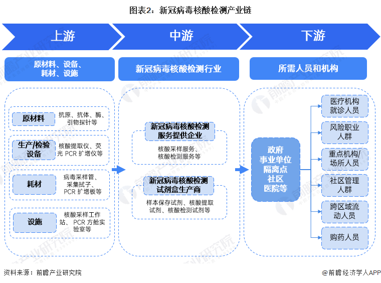 注:上图中下游的新冠病毒核酸检测所需人员范围是根据国务院联防联控机制综合组发布的《关于进一步优化新冠肺炎疫情防控措施 科学精准做好防控工作的通知》中的20条措施进行归纳,后续需求人员或根据政府文件有所变动。