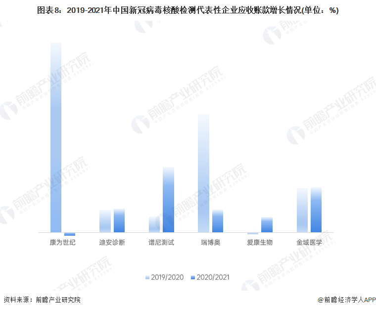 2019-2021年,中国新冠病毒核酸检测代表性企业应收账款趋于增长。2020年,康为世纪、瑞博奥和金域医学的应收账款分别相较2019年增长了307.74%、191.45%和71.66%。2021年,除迪安诊断、谱尼测试和金域医学的其他代表性企业的应收账款增长率均相较2020年有所下降。根据瑞博奥的招股说明书补充文件显示,截至2022年第三季度,企业才收回2019年和2020年的应收账款。