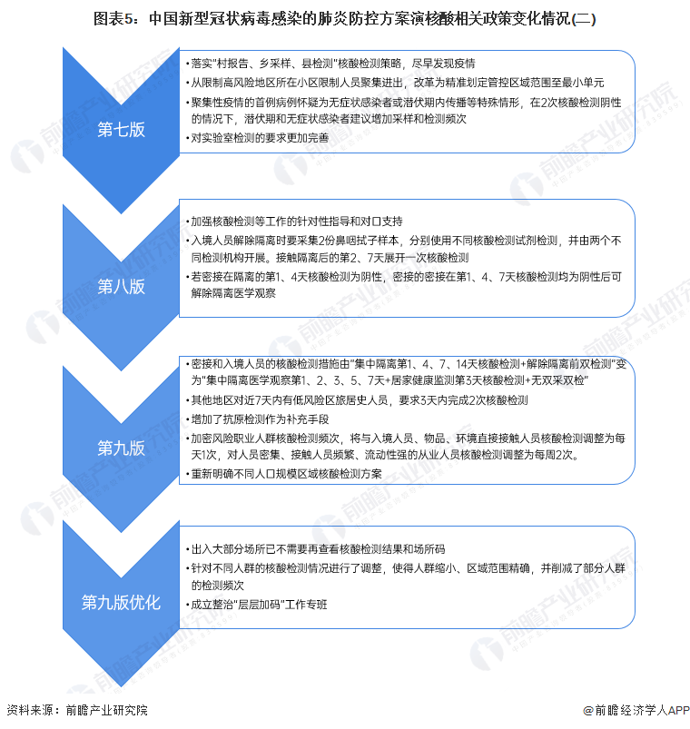 自2020年初国家卫健委发布第一版新型冠状病毒肺炎防控方案开始,截至2022年12月8日,中国共发布了9个版本的新型冠状病毒肺炎防控方案,期间不断的经过科学统计后的调研结果对方案进行更贴合新冠疫情防控情形和迭代和调整,在第7版时已经有核酸检测需求下降的趋势,但并不明显。直至第9版的出台,新冠病毒核酸检测的人群覆盖以及区域范围更加精准,主要规范了更精确的人员范围、锁定了更准确的区域范围、标定了更准确的核酸频次,也标志着中国新冠病毒核酸检测行业迎来重大调整期。