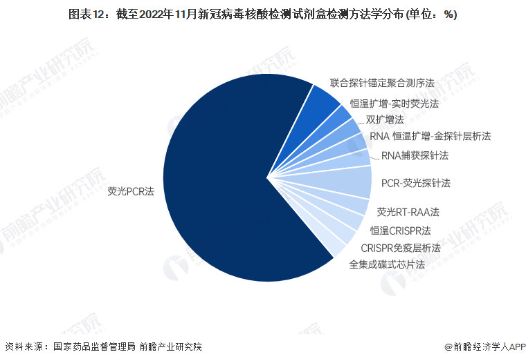 截至2022年11月,新冠病毒核酸检测试剂盒的检测方法学主要是荧光PCR法,此类试剂盒共计占新冠病毒核酸检测试剂盒总数的68%以上。其次是联合探针锚定聚合测序法,该检测方法的试剂盒仅2款,其他检测方法学的新冠病毒核酸检测试剂盒仅1款。