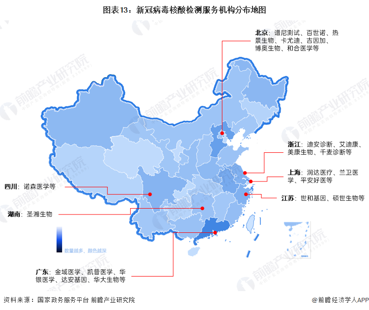 注① :上图区域颜色深浅代表的是“不同地区之间的新冠病毒核酸检测服务机构”的数量多少(服务机构包含医疗机构、疾控机构和第三方检测机构);而图中文字显示的则为当地注册的重点第三方检测机构。