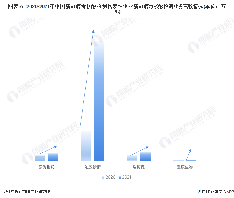 2020-2021年,新冠病毒核酸检测代表性企业营收均呈现较大的增长趋势。其中,迪安诊断的营收增长率较大,(或;)康为世纪和瑞博奥的增长率在30-45%之间,爱康生物的新冠病毒核酸检测相关业务收入虽并不高,但其增长率也呈现较大的增长。