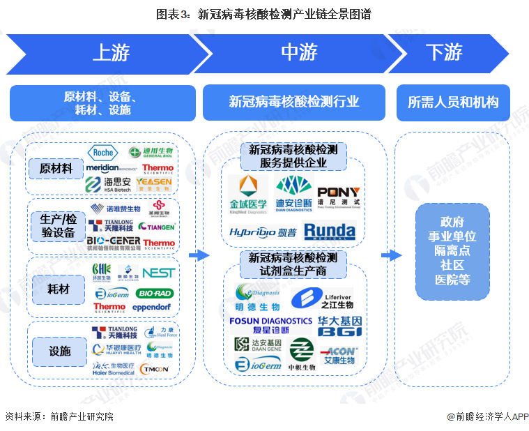 新冠病毒核酸检测行业上游主要是以酶、引物、探针等原材料,核酸提取仪、PCR扩增仪等设备,病毒采样管、PCR扩增板等耗材,以及核酸采样工作站、PCR放舱实验室等配套设施。其应用主要是针对政府发布的相关文件中所需进行新冠病毒核酸检测人员和场所,例如医疗机构就诊人员、风险职业人群等。