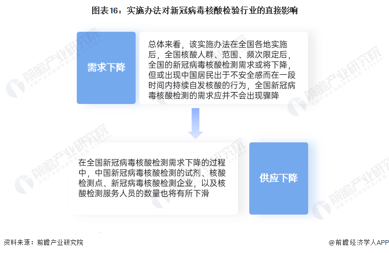 新冠病毒核酸检测的“精准”规定或将在一定程度上减少我国普通居民对新冠病毒核酸检测的需求,同时减少核酸检测点、核酸检测试剂的供应,核酸检测机构的数量也或将下滑,核酸检测机构的核酸检测员等服务人员数量也或将减少。