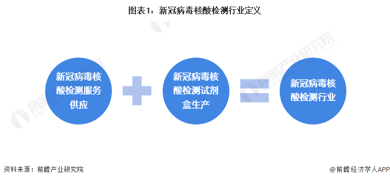 从狭义来看,中国新冠病毒核酸检测行业代指直接面对群众的针对新冠病毒的核酸检测服务提供。从广义上来看,中国新冠病毒核酸检测行业除服务供应以外,还需涵盖新冠病毒核酸检测所用的试剂盒。本篇文章主要围绕广义的行业定义进行分析。