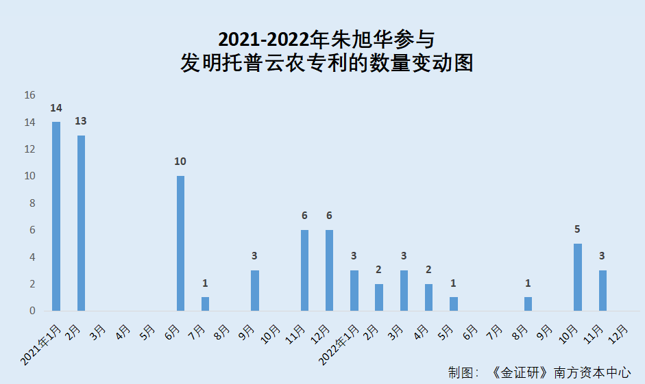 具体来看,2021年1-12月各月,朱旭华作为发明人参与的托普云农专利申请数量分别为14项、13项、0项、0项、0项、10项、1项、0项、3项、0项、6项、6项,共计53项;2022年1-12月,朱旭华作为发明人参与的托普云农专利申请数量分别为3项、2项、3项、2项、1项、0项、0项、1项、0项、5项、3项、0项,共计20项。