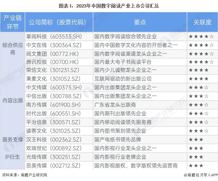 数字阅读产业上游包括内容制作方和内容出版方(如出版社和网文平台等),中游包括阅读渠道(通常由上游网文平台综合服务),上市企业有掌阅科技(603533.SH)、阅文集团(00772.HK)、腾讯控股(00700.HK)等,下游为阅读市场。另外,还有服务支撑体系如电子阅读器市场,以及IP衍生如改编聚集等。具体上市公司信息如下: