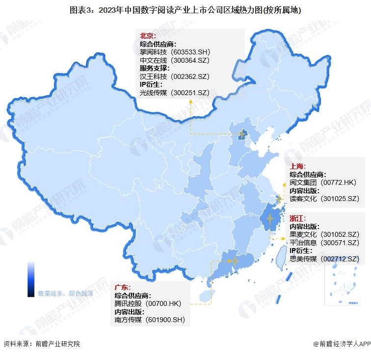 从数字阅读产业上市公司的地区分布来看,北京数字阅读产业的上市企业数量最多,其中不乏掌阅科技(603533.SH)、中文在线(300364.SZ)等优势企业。浙江、广东和上海三地的数字阅读产业的上市企业数量亦较多。浙江有果麦文化(301052.SZ)、平治信息(300571.SZ)优质内容平台企业;广东依托微信读书母公司腾讯控股(00700.HK)优势较大;上海阅文集团(00772.HK)旗下起点中文网拥有大量优质网络小说资源。