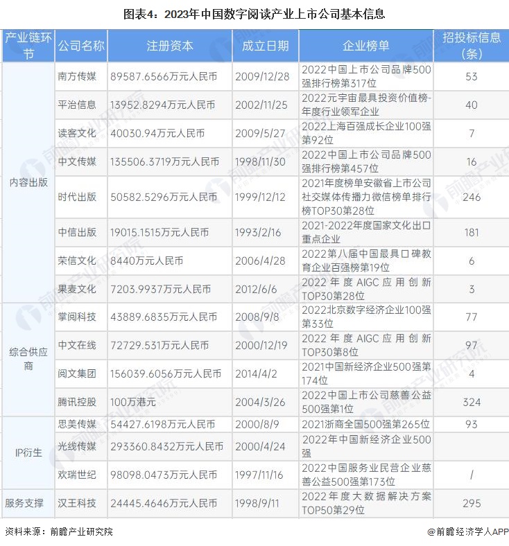 从数字阅读行业的上市企业布局和已有公开信息分析,注册资本最多为光线传媒(300251.SZ);招投标信息最多的上市企业为腾讯控股(00700.HK);而成立时间最早的是中信出版(300788.SZ)。