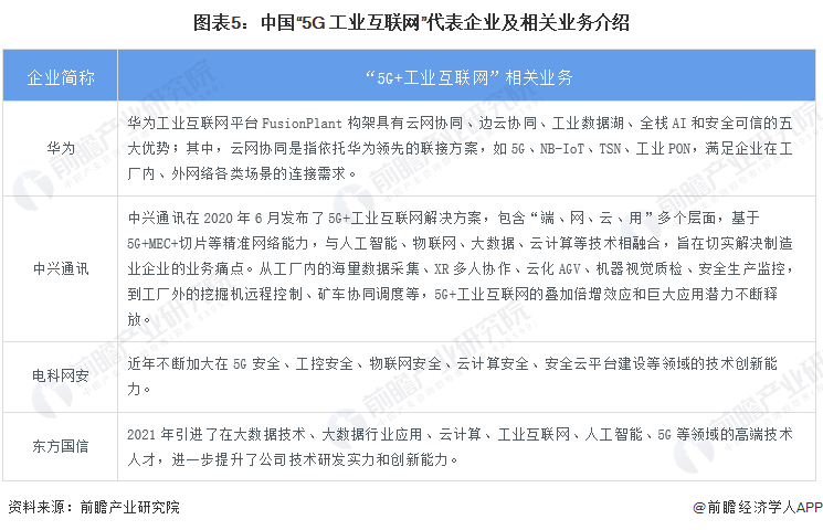 目前,“5G+工业互联网”代表企业有华为、中兴通讯、电科网安(曾用名:卫士通)、东方国信等。