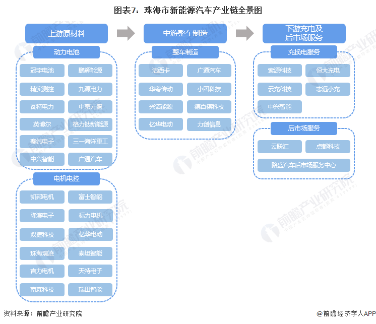 目前,新能源汽车产业链主要分为上游原材料,中游整车制造以及下游充电及后市场服务三个方面,而珠海市在产业链的上中下游均有企业布局,已形成较完整的产业链,如上游动力电池企业有冠宇电池、中兴智能等,电机电控企业有凯邦电机、富士智能等,中游整车制造企业有广通汽车、华粤传动等,下游充换电服务有索源科技、中兴智能等,后市场服务有云联汇、点都科技等,具体产业链全景图谱如下:
