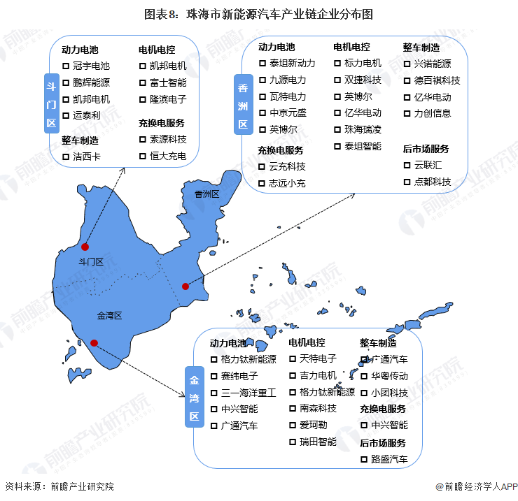 从地区分布看,香洲区和金湾区的产业链较为完整,各环节均有企业布局,而斗门区缺少下游后市场服务的企业布局。