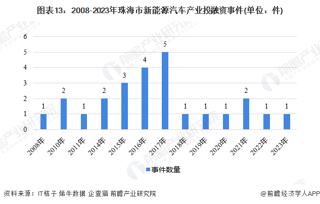 根据IT桔子、烯牛数据以及企查猫所查询的2008-2023年珠海市新能源汽车产业投融资事件,自2014年以来每年均有投融资事件,2017年投融资事件最多,可以看出近年来珠海市新能源汽车产业的投融资活跃度处于比较稳定的水平。