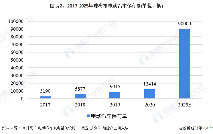 根据《珠海市电动汽车充电基础设施“十四五”规划》,2017-2020年珠海市电动汽车保有量从3190辆增长到12414辆,平均增长率为54.10%,最高增长率为84.23%。预计“十四五”期间,珠海市电动汽车保有量平均增长率为50%-60%之间,到2025年电动汽车保有量将在9万至13万辆之间。