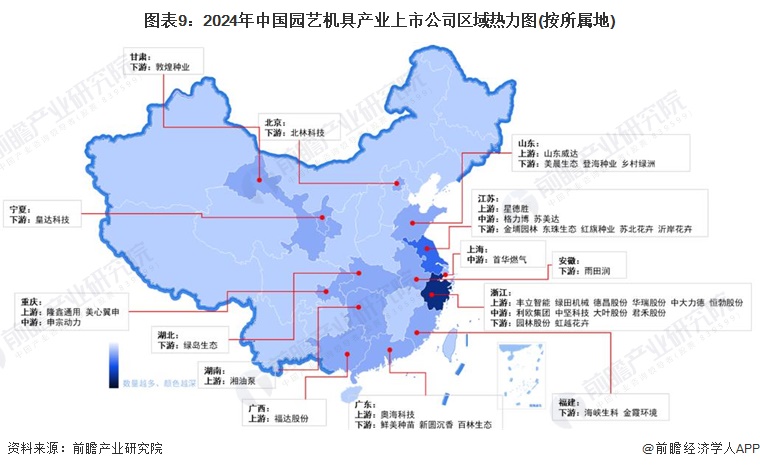 园艺机具产业链上的上市企业遍布全国多个省份,上游产业主要集中在浙江省。中游园艺机具制造企业上市企业主要在江苏省、浙江省、上海市等华东沿海地区,其中浙江省园艺机具制造上市企业有利欧集团、中坚科技等,江苏省园艺机具制造上市企业主要有格力博、苏美达等。