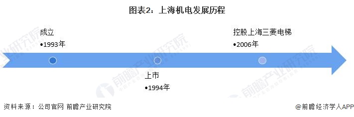 上海机电股份有限公司原名上海上菱电器股份有限公司,是1993年7月29日经上海市经济委员会以沪经企字第331号文批准设立的股份有限公司。1994年2月24日,公司在上海证券交易所上市。2006年,公司出资控股上海三菱电梯有限公司,持股比例52%,上海三菱电梯有限公司是其电梯业务的制造经营中枢。具体发展历程如下: