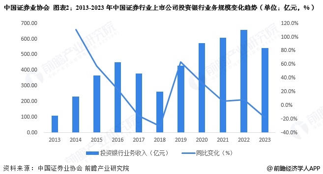 2022年我国证券行业上市公司投资银行业务规模升至659.21亿元,较上年同期增加8.2%。2023年,股权融资环境持续收紧,监管政策也更加严格,导致投行业务收入下降至541.62亿元,同比下降17.8%。