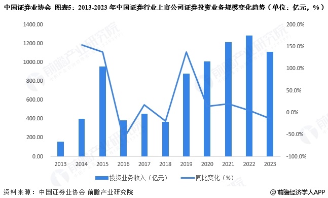 2013-2023年,我国证券行业上市公司投资业务规模保持波动上升态势,波动幅度较大。2023年券商机构自营投资业务普遍承压,整体规模下滑,降至1113.1亿元,较2022年同期下降13.4%。
