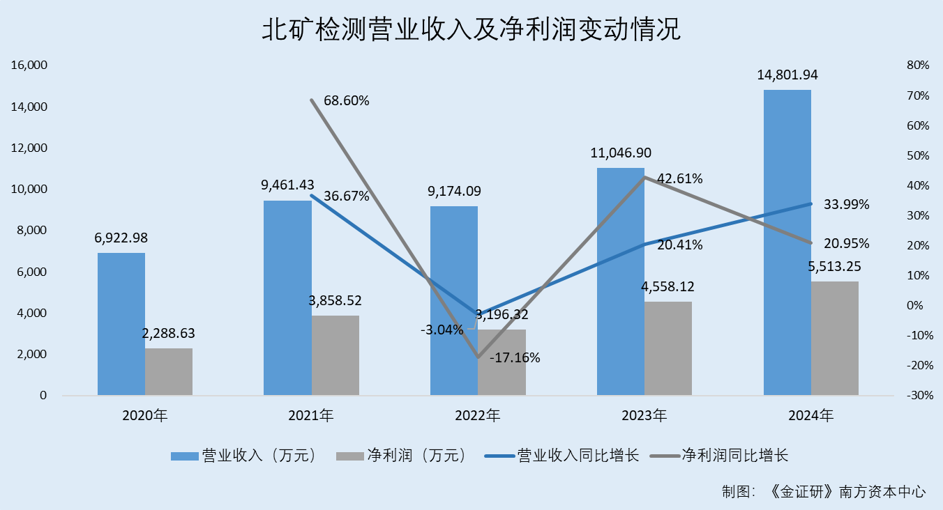 2020-2024年,北矿检测的净利润2,288.63万元、3,858.52万元、3,196.32万元、4,558.12万元、5,513.25万元,2021-2024年分别同比增长68.6%、-17.16%、42.61%、20.95%。