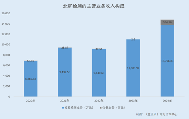 即2020-2024年,北矿检测收入超九成来自检验检测业务,仪器业务收入占比不足一成。