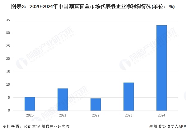 以行业头部企业泡泡玛特的盈利情况来看,2020-2024年公司净利润情况呈现波动增长趋势,且在2024年呈现大幅度增长态势,反映潮玩盲盒在2024年热度大涨,企业的净利润处于较高水平。一方面反映该企业在2024年经营火爆,另一方面作为业内头部企业也反映行业整体净利润上涨。