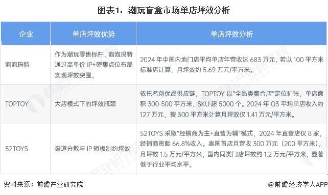 潮玩盲盒市场中,泡泡玛特凭借高单价IP与密集点位,100平方米标准店月坪效约5.69万元/平方米,高溢价产品推动单位面积产出,显著提升盈利能力。TOPTOY以全品类大店扩张,300平方米门店月坪效仅1.41万元/平方米,受品类结构不合理、体验成本高拖累,单位面积利润难覆盖成本。52TOYS以经销商模式为主,国内门店月坪效约1.2万元/平方米,渠道分散与IP短板导致溢价低、管控弱,盈利能力受限。总体而言,单店坪效与盈利能力紧密相关,高坪效企业在市场竞争中占据优势,能更好地实现盈利,而低坪效企业则需通过优化品类、降低成本等方式提升盈利能力。