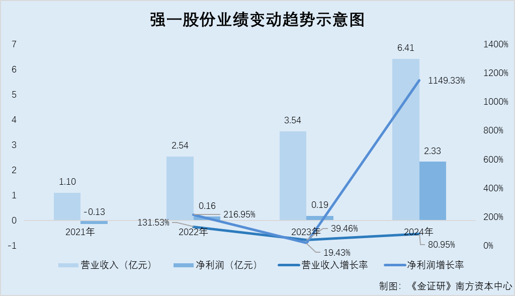 据2024年12月22日招股书及2025年9月5日招股书,2021-2024年及2025年1-6月,强一股份的营业收入分别为1.1亿元、2.54亿元、3.54亿元、6.41亿元、3.74亿元。2022-2024年,营收分别同比增长131.53%、39.46%、80.95%。